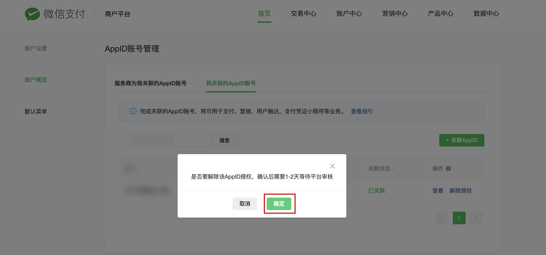 4、对应解绑的商户号登录商户平台,前往「产品中心」->「AppID账号管理」->「我关联的AppID账号」,找到对应小程序,点击「解除授权」并确定;